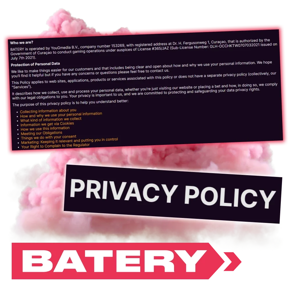 Upon registration, each user confirms that they have read Batery’s privacy policy and agree to all the terms and conditions described therein. This document contains information about the principles of collecting players’ personal data, how it is stored and protected, and the purposes for which it is used.