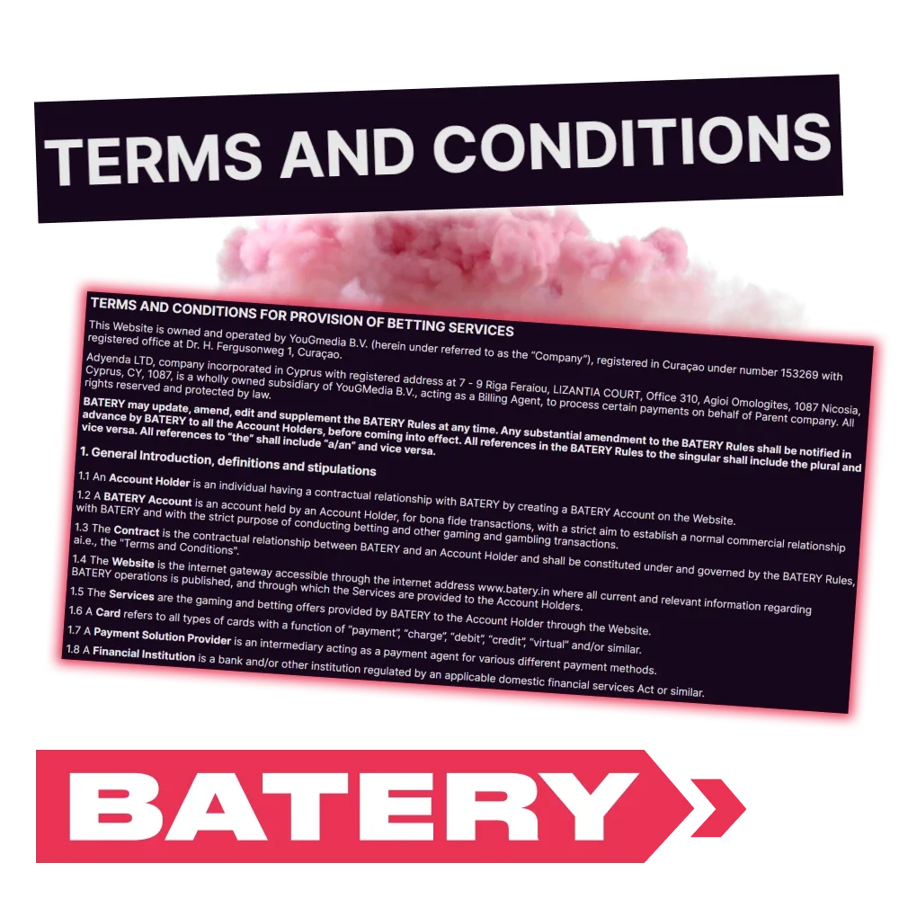 - By registering on the official Batery website in India, the user guarantees that they do not reside in excluded countries where gambling is prohibited by law;